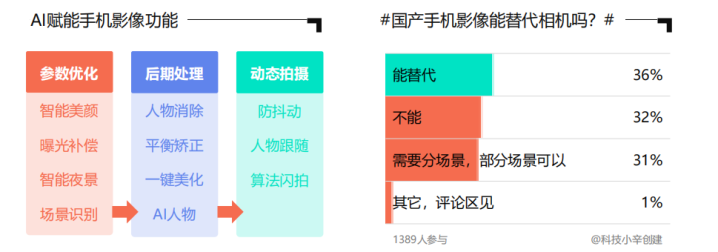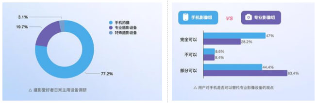 手机相机的专业化趋势和便携性,让优质照片的生产门槛变得更低,用户也不再只依赖专业相机。根据微博调研发现,随着国产手机成像技术的不段提高,有36%的用户认为手机能替代专业相机。同时手机摄影在借助AI技术的应用下,使拍照更简单方便,也能让照片在后期优化过程中更加智能。