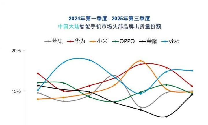 去年到今年,荣耀在销量方面就存在极大的挑战,IDC数据显示,荣耀手机市场份额从2024年第一季度的17.1%的第一名,一路下滑至第四季度的13.7%,排名第五,并在2025年第一季度跌出前五。而又据Omdia的最新研究显示,2025年第三季度,在中国大陆智能手机市场头部品牌出货量份额统计中发现,荣耀仍是跌出前五的行列,被归集为“其他”。
